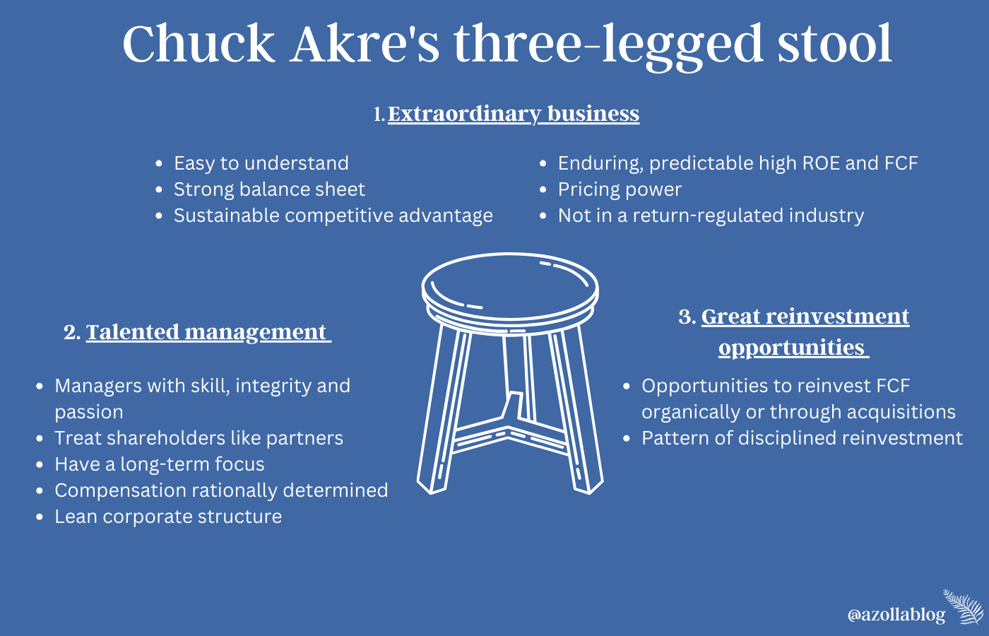 This metaphoric stool symbolises stability and durability, with each leg describing what Chuck Akre looks for in an investment.