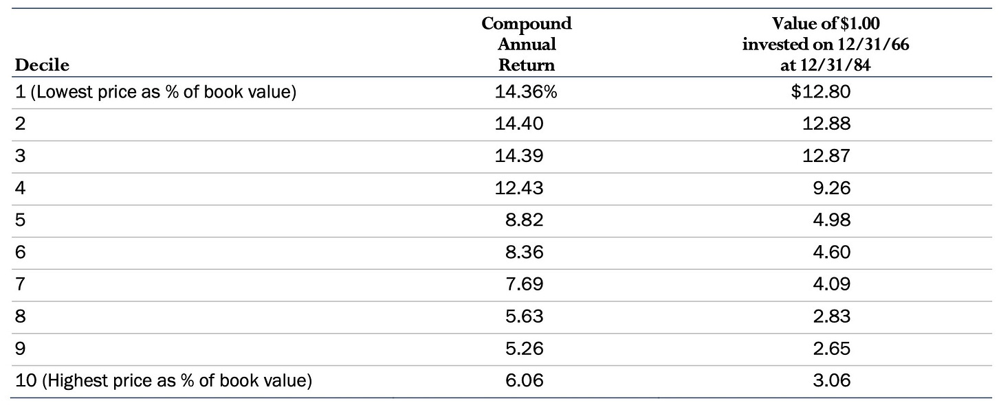 Roger Ibbotson, Professor at Yale School of Management wrote a paper comparing the investment returns of stocks trading at different price to book values. From 1966 to 1984 he took all stocks listed on the NYSE and ranked them into deciles, from stocks trading at the lowest price to book values to stocks trading at the highest price to book values.