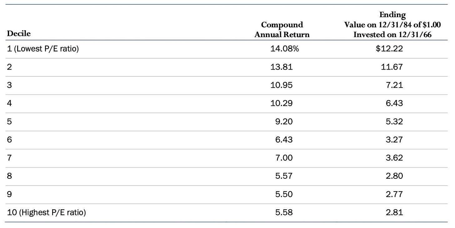 In a similar fashion to the analysis carried out on price to book value, Robert Ibbotson also ranked all NYSE listed stocks and sorted them into deciles based on their price to earnings ratios and measured their investment returns over 1966 to 1984.