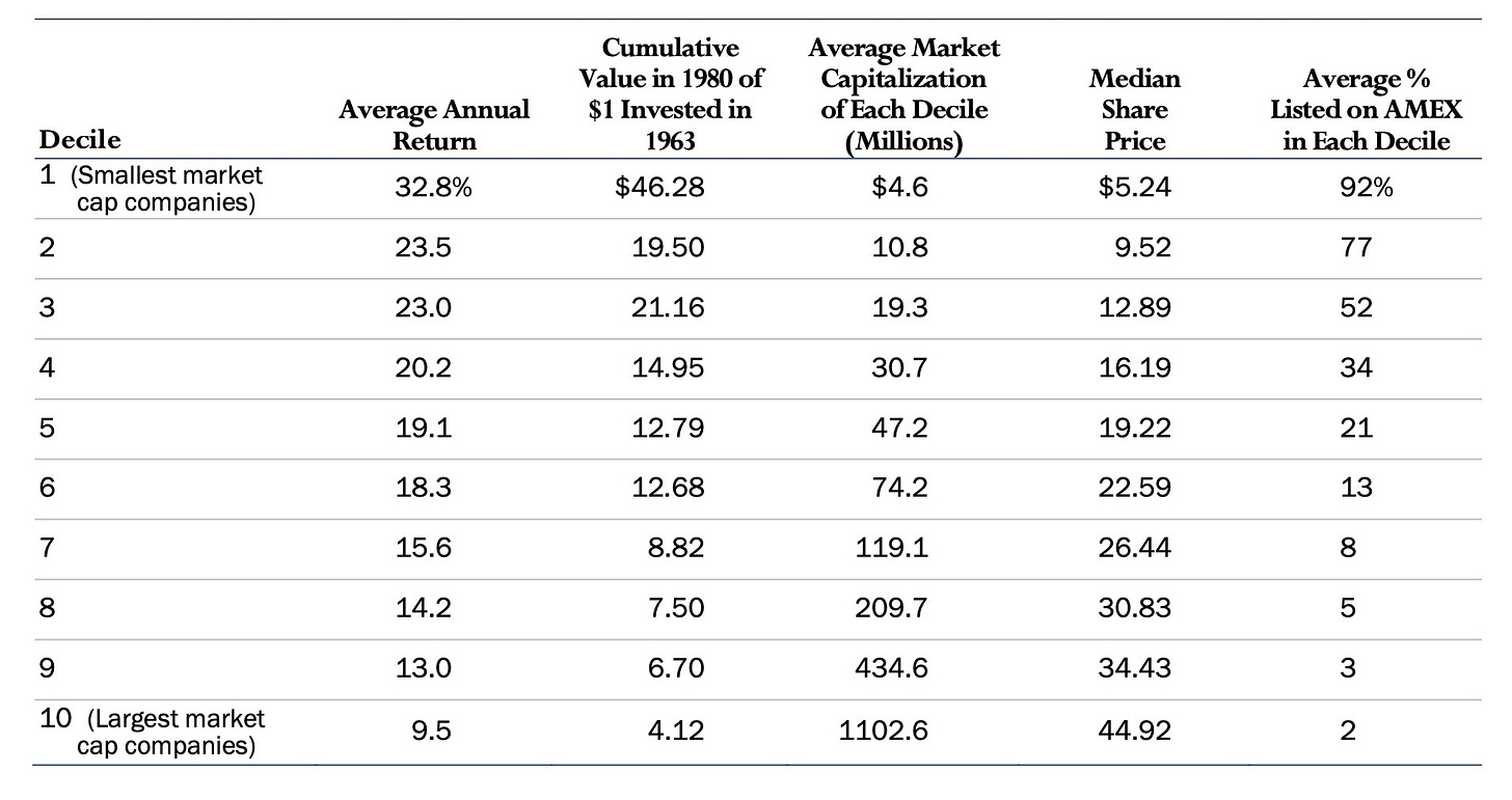 Marc Reinganum listed all stocks listed on the NYSE and AMEX and ranked them based on their market caps and placed them into deciles, over 1963 to 1980.
